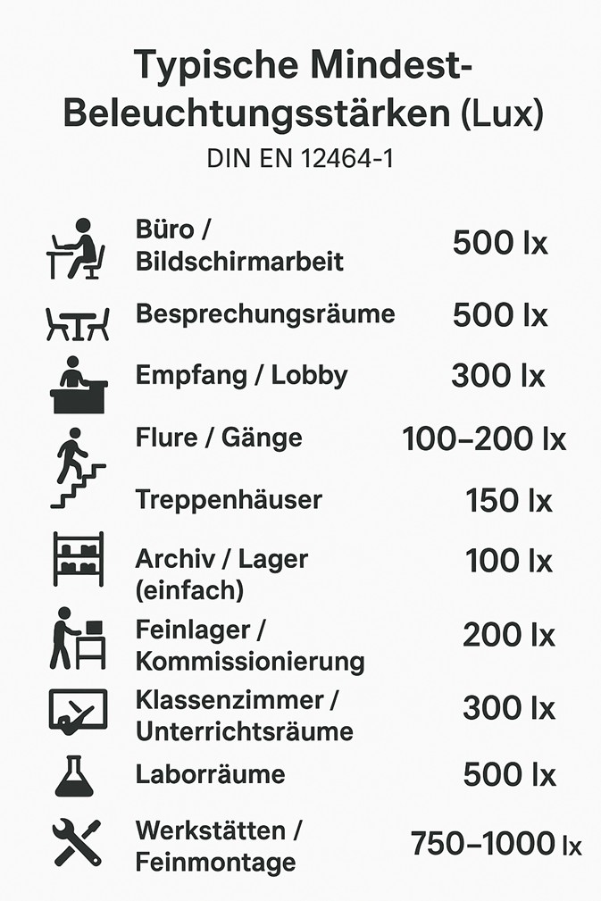 (z. B. 500 lx für Büroarbeit, 300 lx für Klassenzimmer, 150 lx für Flure).